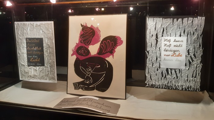Das sagen die beiden Papptafeln, eine weiße und eine schwarze, kunstvoll mit einer Struktur aus Seidenpapier beklebt. Sie rahmen den monochromen Druck mit den violetten Flügeln. Unter dem Eindruck des Attentats auf Martin Luther King schuf HAP Grieshaber seinen Druck, der in der Mitte des Schaukastens hängt. Er zeigt eine knieende, nach hinten fallende schwarze Figur. Oberhalb des Kopfes sind dort, wo man vielleicht die Arme vermuten würde, bei genauerem Hinsehen zwei schwarze Flügel zu sehen. Kopf und Flügel sind von großen violettroten Farbflächen umfangen, Symbol für das Blut und den Tod. Die Flügel stehen wohl für die Auferstehung des toten Bürgerrechtlers, auf jeden Fall ist eine Bewegung nach oben angedeutet, die das Leid des Todes überwindet.