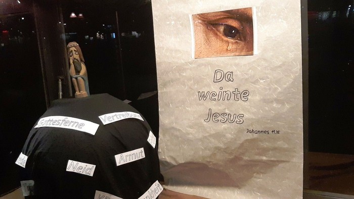 Der aktuelle Schaukasten greift das Thema sehr plastisch auf: Eine riesige mit schwarzem Stoff bezogene Kugel symbolisiert die Erde, unsere Welt. Darauf sind Schilder angebracht, die allesamt Umstände benennen, die Jesus wohl zum Weinen gebracht hätten. Außer den Andachtsthemen: Vertreibung, Folter, Hass, Hochmut, Habgier, Neid, üble Nachrede aber auch Gottesferne und Trägheit.